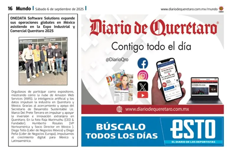Querétaro, Mexico, September 6, 2025— OneData Software Solutions has been featured in El Diario de Querétaro, a leading regional newspaper, following its participation in the Querétaro 2025 Industrial and Commercial Expo, where our CEO & Founder Mr. Raja Marimuthu and Humberto Rosales as VP of Business Development North America and Mexico Managing Partner highlighted the company demonstrated how advanced technologies such as Amazon Web Services (AWS), artificial intelligence, and data solutions are transforming industries in Querétaro and across Mexico.
